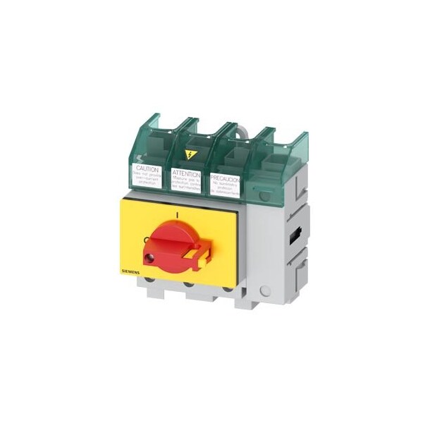 SENTRON, Molded case switch 3LD5 UL, Emergency switching-off, 4-pole, certified according to UL489 UL60947-4-1 and IEC60947-3, UL: 60A, SCCR 50kA at 480VAC, Operating power at 480VAC 3-phase: 40hp, IEC: 63A, Operating power at AC-23A at 400V: 30kW, floor mounting with direct handle, red/yellow, incl. terminal covers for the infeed side