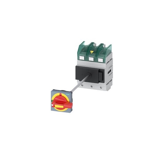 SENTRON, Molded case switch 3LD5 UL, Emergency switching-off, 3-pole, certified according to UL489 UL60947-4-1 and IEC60947-3, UL: 150A, SCCR 50kA at 480VAC, Operating power at 480VAC 3-phase: 100hp, IEC: 160A, Operating power at AC-23A at 400V: 75kW, floor mounting with door coupling rotary operating mechanism, defeatable, emergency switching-off, 4-hole mounting of the handle, without tolerance compensation, incl. terminal covers for the infeed side
