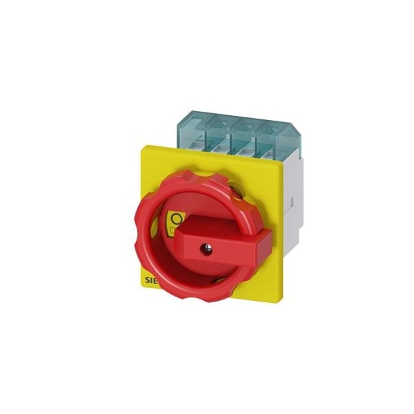 SENTRON, Switch disconnector 3LD, emergency switching-off switch, 4- pole, Iu: 16 A, operating power / at AC-23 A 400 V: 7.5 kW, front-mounted, rotary operating mechanism, Red / yellow, 4-hole mounting of the handle