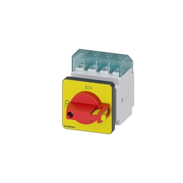 SENTRON, Switch disconnector 3LD, emergency switching-off switch, 3- pole, Iu: 16 A, operating power / at AC-23 A 400 V: 7.5 kW, front-mounted, knob-operated mechanism, red/yellow, 4-hole mounting of the handle