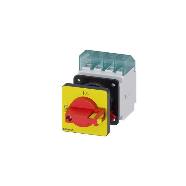 SENTRON, Switch disconnector 3LD, emergency switching-off switch, 3- pole, Iu: 16 A, operating power / at AC-23 A 400 V: 7.5 kW, front-mounted, knob-operated mechanism, Red / yellow, central mounting 22.5 mm of the handle