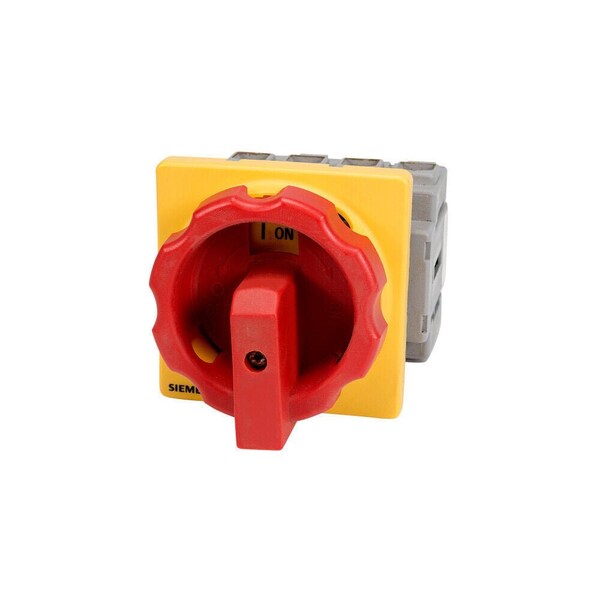 SENTRON, Switch disconnector 3LD, emergency switching-off switch, 3- pole, Iu: 25 A, operating power / at AC-23 A 400 V: 9.5 kW, front-mounted, rotary operating mechanism, Red / yellow, 4-hole mounting of the handle