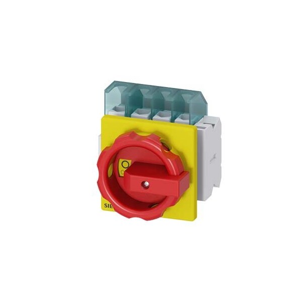 SENTRON, Switch disconnector 3LD, emergency switching-off switch, 4- pole, Iu: 25 A, operating power / at AC-23 A 400 V: 9.5 kW, front-mounted, 1 NC, 1 NO, rotary operating mechanism, Red / yellow, 4-hole mounting of the handle