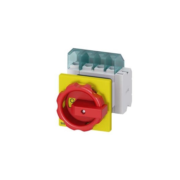 SENTRON, Switch disconnector 3LD, emergency switching-off switch, 4- pole, Iu: 25 A, operating power / at AC-23 A 400 V: 9.5 kW, front-mounted, 1 NC, 1 NO, rotary operating mechanism, Red / yellow, Central mounting 22.5 mm of the handle