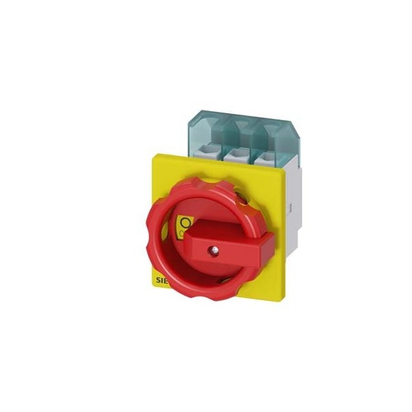 SENTRON, Switch disconnector 3LD, emergency switching-off switch, 3- pole, Iu: 32 A, operating power / at AC-23 A 400 V: 11.5 kW, front-mounted, rotary operating mechanism, Red / yellow, 4-hole mounting of the handle
