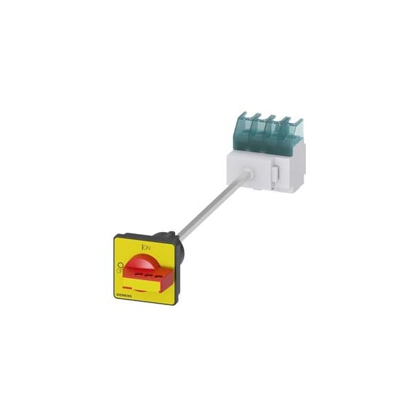 SENTRON, switch disconnector 3LD, EMERGENCY OFF switch, 4-pole, Iu: 32 A, Operating power / at AC-23 A at 400 V: 11.5 kW, floor mounting with door coupling, defeatable knob-operated mechanism, red/yellow, 4-hole mounting of the handle