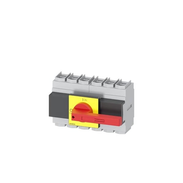 SENTRON, Switch disconnector 3LD, emergency switching-off switch, 6- pole, Iu: 160 A, operating power / at AC-23 A 400 V: 75 kW, front-mounted, knob-operated mechanism, red/yellow, 4-hole mounting of the handle