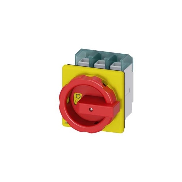SENTRON, Switch disconnector 3LD, emergency switching-off switch, 3- pole, Iu: 125 A, operating power / at AC-23 A 400 V: 45 kW, front-mounted, rotary operating mechanism, Red / yellow, 4-hole mounting of the handle
