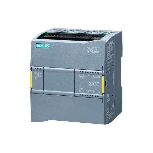 SIMATIC S7-1200, CPU 1212FC, compact CPU, DC/DC/relay, onboard I/O: 8 DI 24 V DC, 6 DO relay 2 A, 2 AI 0-10 V DC, power supply: DC 20.4-28.8 V DC, program/data memory 150 KB