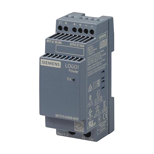 Stabilized Power Supply, Input Voltage 100 to 240V AC, Output Voltage 5V DC, Power Rating 15W, Output Amps 3, Mounting DIN Rail, Height 90 mm, Width 36 mm, Depth 53 mm, Series Logo!Power, Hz 47 to 63 Hz, Phase - Electrical Single, IP Rating IP20, Status Indicator Green LED OK Signal