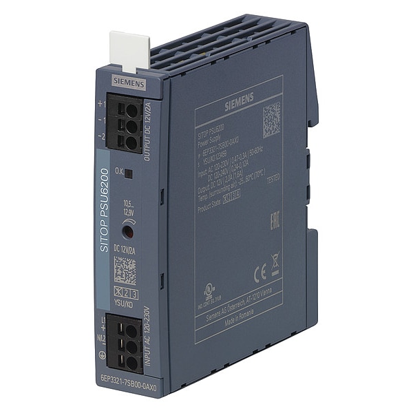 Stabilized Power Supply, Input Voltage 110 to 240V DC, 120 to 230V AC, Output Voltage 12V DC, Power Rating 28.5W, Output Amps 2, Mounting DIN Rail, Height 90 mm, Width 36 mm, Depth 53 mm, Series SITOP PSU6200, Hz 47 to 63 Hz, Phase - Electrical Single, IP Rating IP20, Status Indicator LED/DC OK Signal