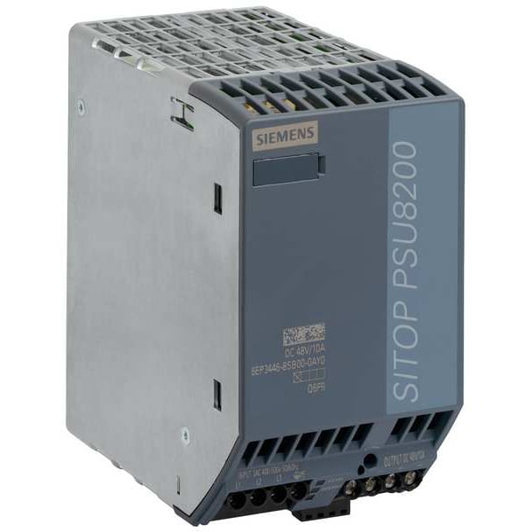 Stabilized Power Supply, Input Voltage 400 to 500V AC, Output Voltage 48V DC, Power Rating 480W, Output Amps 10, Mounting DIN Rail, Height 125 mm, Width 70 mm, Depth 125 mm, Series SITOP PSU8200, Hz 47 to 63 Hz, Phase - Electrical Three, IP Rating IP20, Status Indicator LED