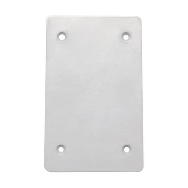 Features Shape: Rectangle Material: Plastic Number of Gangs: 1 gang Product Type: Blank Box Cover Application: Closure of Unused Box Outlets Color: White Height: 5-11/16 in. Width: 3-7/8 in. Depth: 1/4 in. UL Listed: Yes cULus Marine Listed