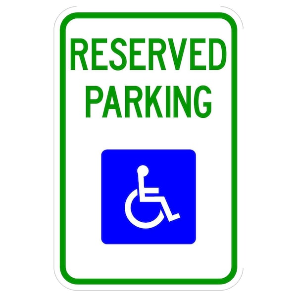 Reserved Parking Handi Logo 12X18 Diamond Grade Cubed Reflective .063 Aluminum Thickness - Sign Spec's: MUTCD:, CUS00070, Sign Category:, Specialty, Header/Legend:, Reserved Parking, Handi Logo, Legend, Text Color:, Blue & Green, Background Color:, White, Aluminum Grade & Temper:, 5052-H38, Hole Punch Pattern:, Federal Punch: 2 Holes T&B Centered, 1.5 inset, Hole Diameter: 7/16 , Hole Punch Shape:, Round, Radius Corners: , 1.5