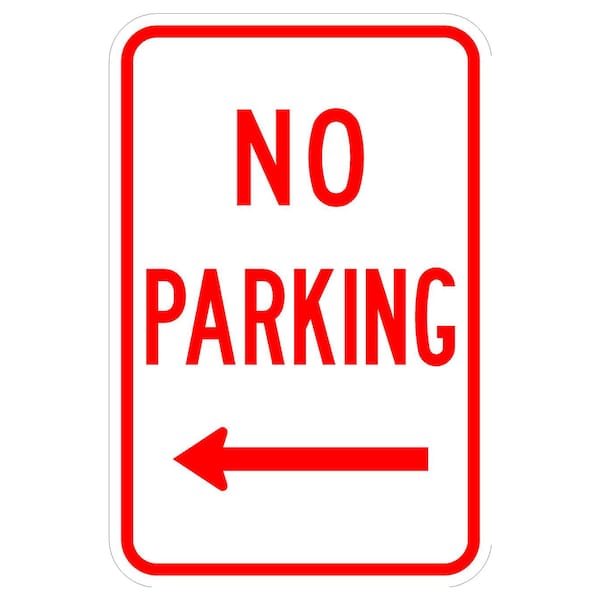 No Parking Left Arrow 12X18 Diamond Grade Cubed Reflective .063 Aluminum Thickness - Sign Spec's: MUTCD:, CUS00140, Sign Category:, Specialty, Header/Legend:, No Parking <-, Legend, Text Color:, Red, Background Color:, White, Aluminum Grade & Temper:, 5052-H38, Hole Punch Pattern:, Federal Punch: 2 Holes T&B Centered, 1.5 inset, Hole Diameter: 7/16 , Hole Punch Shape:, Round, Radius Corners: , 1.5