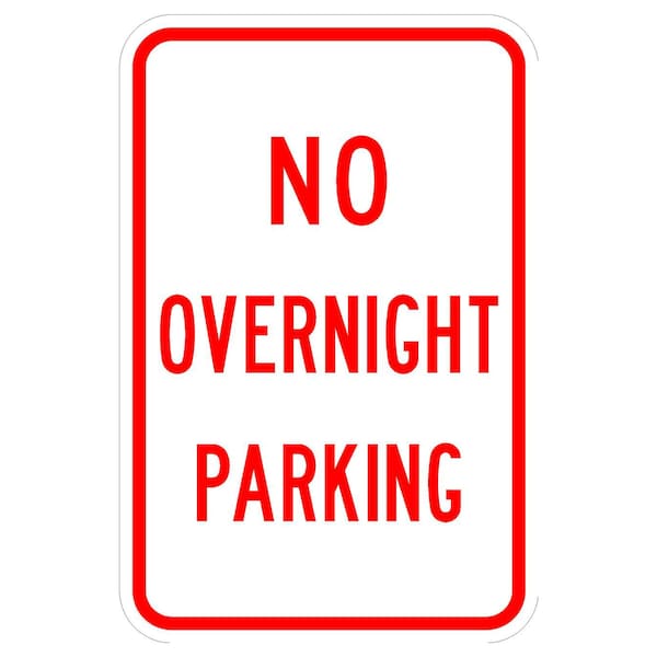 No Overnight Parking 12X18 Diamond Grade Cubed Reflective .100 Aluminum Thickness - Sign Spec's: MUTCD:, CUS00131, Sign Category:, Specialty, Header/Legend:, No Overnight Parking , Legend, Text Color:, Red, Background Color:, White, Aluminum Grade & Temper:, 5052-H38, Hole Punch Pattern:, Federal Punch: 2 Holes T&B Centered, 1.5 inset, Hole Diameter: 7/16 , Hole Punch Shape:, Round, Radius Corners: , 1.5
