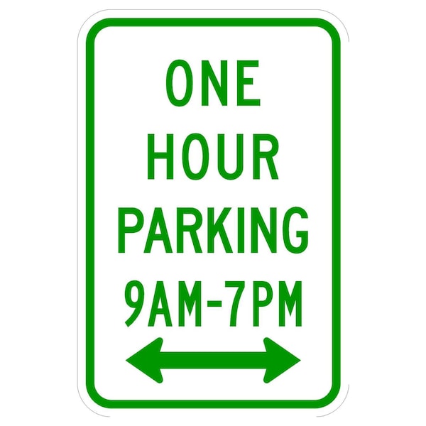 One Hour Parking 9AM 7PM < > 12X18 Diamond Grade Cubed Reflective .063 Aluminum Thickness - Sign Spec's: MUTCD:, R7-5, Sign Category:, Regulatory, Header/Legend:, One Hour Parking 9AM - 7PM Double Arrow, Legend, Text Color:, Green, Background Color:, White, Aluminum Grade & Temper:, 5052-H38, Hole Punch Pattern:, Federal Punch: 2 Holes T&B Centered, 1.5 inset, Hole Diameter: 7/16 , Hole Punch Shape:, Round, Radius Corners: , 1.5
