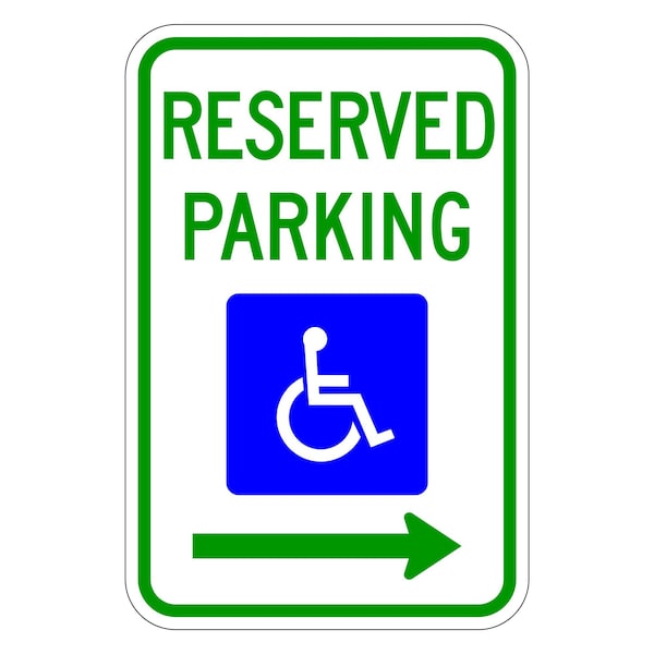 Reserved Parking Right Arrow 12X18 Diamond Grade Cubed Reflective .063 Aluminum Thickness - Sign Spec's: MUTCD:, R7-8R, Sign Category:, Regulatory, Header/Legend:, Reserved Parking Right Arrow, Legend, Text Color:, Blue & Green, Background Color:, White, Aluminum Grade & Temper:, 5052-H38, Hole Punch Pattern:, Federal Punch: 2 Holes T&B Centered, 1.5 inset, Hole Diameter: 7/16 , Hole Punch Shape:, Round, Radius Corners: , 1.5
