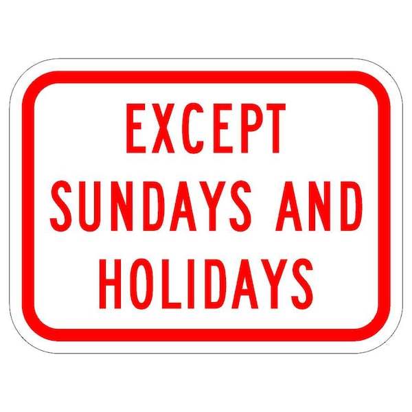 Except Sundays And Holidays 30X24 Diamond Grade Cubed Reflective .125 Aluminum Thickness - Sign Spec's: MUTCD:, R8-3bP, Sign Category:, Regulatory, Header/Legend:, Except Sundays And Holidays, Legend, Text Color:, Red, Background Color:, White, Aluminum Grade & Temper:, 5052-H38, Hole Punch Pattern:, Federal Punch: 2 Holes T&B Centered, 3 inset, Hole Diameter: 7/16 , Hole Punch Shape:, Round, Radius Corners: , 1.5