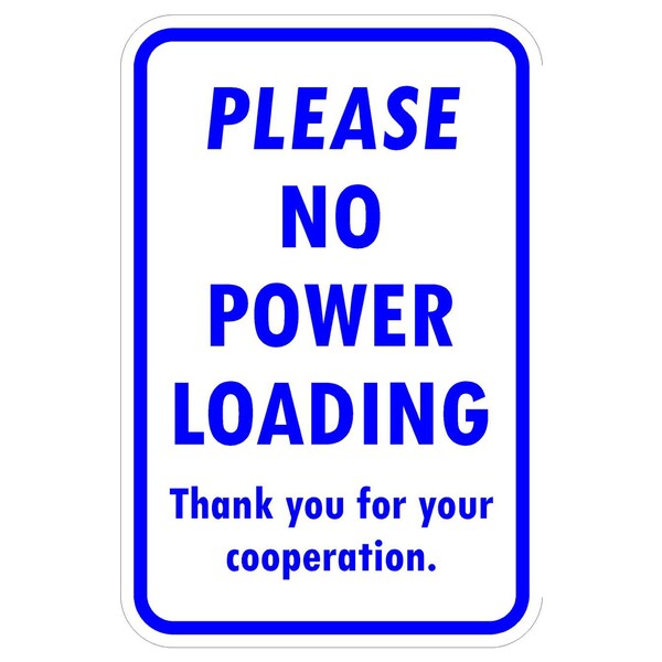 Please No Power Loading Thankyou 12X18 Diamond Grade Cubed Reflective .125 Aluminum Thickness - Sign Spec's: MUTCD:, CUS00003, Sign Category:, Specialty, Header/Legend:, Please No Power Loading Thankyou , Legend, Text Color:, Blue, Background Color:, White, Aluminum Grade & Temper:, 5052-H38, Hole Punch Pattern:, Federal Punch: 2 Holes T&B Centered, 1.5 inset, Hole Diameter: 7/16 , Hole Punch Shape:, Round, Radius Corners: , 1.5