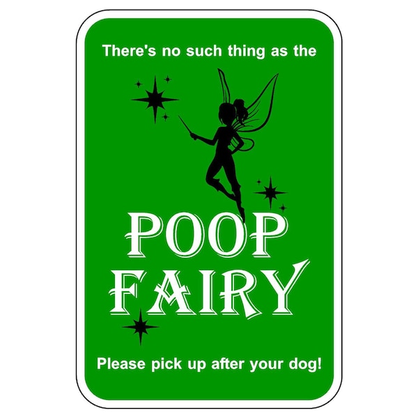 Poop Fairy 12X18 Diamond Grade Cubed Reflective .063 Aluminum Thickness - Sign Spec's: MUTCD:, CUS00055, Sign Category:, Specialty, Header/Legend:, Poop Fairy, Legend, Text Color:, Black & Green, Background Color:, White, Aluminum Grade & Temper:, 5052-H38, Hole Punch Pattern:, Federal Punch: 2 Holes T&B Centered, 1.5 inset, Hole Diameter: 7/16 , Hole Punch Shape:, Round, Radius Corners: , 1.5