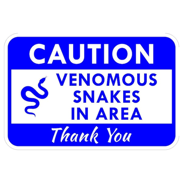 Caution Venomous Snakes In Area TY 18X12 Diamond Grade Cubed Reflective .125 Aluminum Thickness - Sign Spec's: MUTCD:, CUS00120, Sign Category:, Specialty, Header/Legend:, Caution Venomous Snakes In Area TY, Legend, Text Color:, Blue, Background Color:, White, Aluminum Grade & Temper:, 5052-H38, Hole Punch Pattern:, Federal Punch: 2 Holes T&B Centered, 1.5 inset, Hole Diameter: 7/16 , Hole Punch Shape:, Round, Radius Corners: , 1.5