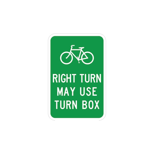Bike Right Lane Turn Box 12X18 Diamond Grade Cubed Reflective .100 Aluminum Thickness - Sign Spec's: MUTCD:, D11-20R, Sign Category:, Bicycle Facility , Header/Legend:, Bike Symbol RT Lane Turn Box, Legend, Text Color:, White, Background Color:, Green, Aluminum Grade & Temper:, 5052-H38, Hole Punch Pattern:, Federal Punch: 2 Holes T&B Centered, 1.5 inset, Hole Diameter: 7/16 , Hole Punch Shape:, Round, Radius Corners: , 1.5