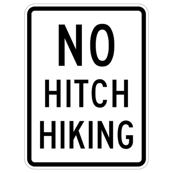 No Hitch Hiking 18X24 Diamond Grade Cubed Reflective .063 Aluminum Thickness - Sign Spec's: MUTCD:, R9-4A, Sign Category:, Regulatory, Header/Legend:, No Hitch Hiking , Legend, Text Color:, Black, Background Color:, White, Aluminum Grade & Temper:, 5052-H38, Hole Punch Pattern:, Federal Punch: 2 Holes T&B Centered, 3 inset, Hole Diameter: 7/16 , Hole Punch Shape:, Round, Radius Corners: , 1.5