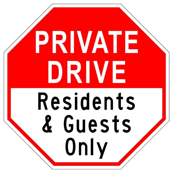 Private Dr Residents & Guest 24X24 Diamond Grade Cubed Reflective .063 Aluminum Thickness - Sign Spec's: MUTCD:, CUS00223, Sign Category:, Specialty, Header/Legend:, Private Dr Residents&Guest, Legend, Text Color:, Red & Black, Background Color:, White, Aluminum Grade & Temper:, 5052-H38, Hole Punch Pattern:, Federal Punch: 2 Holes T&B Centered, 3 inset, Hole Diameter: 7/16 , Hole Punch Shape:, Round, Radius Corners: , Octagon