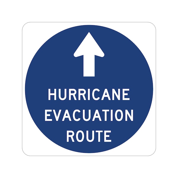 Hurricane Evacuation Route 24X24 Diamond Grade Cubed Reflective .125 Aluminum Thickness - Sign Spec's: MUTCD:, EM 1, Sign Category:, Emergency, Header/Legend:, Symbol Hurricane Evacuation Route, Legend, Text Color:, Black & Blue, Background Color:, White, Aluminum Grade & Temper:, 5052-H38, Hole Punch Pattern:, Federal Punch: 2 Holes T&B Centered, 3 inset, Hole Diameter: 7/16 , Hole Punch Shape:, Round, Radius Corners: , 1.5