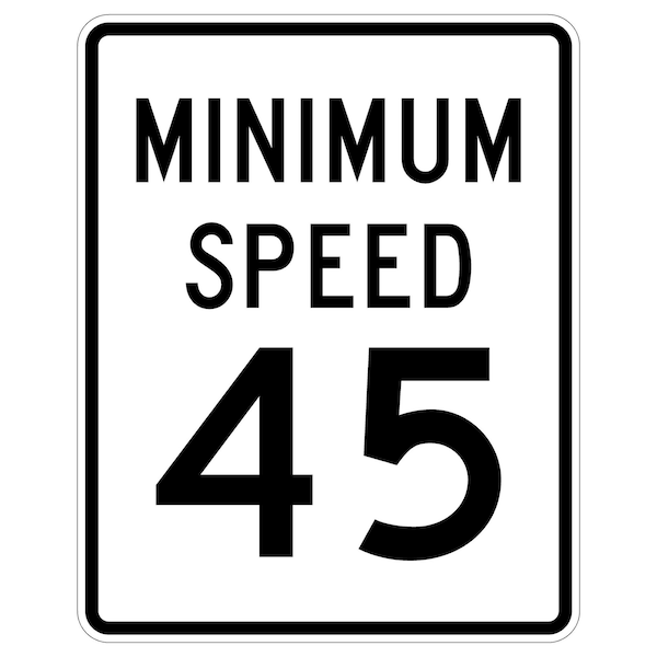 Minimum Speed 45 24X30 Diamond Grade Cubed Reflective .063 Aluminum Thickness - Sign Spec's: MUTCD:, R2-4P45, Sign Category:, Regulatory, Header/Legend:, Minimum Speed 45, Legend, Text Color:, Black, Background Color:, White, Aluminum Grade & Temper:, 5052-H38, Hole Punch Pattern:, Federal Punch: 2 Holes T&B Centered, 3 inset, Hole Diameter: 7/16 , Hole Punch Shape:, Round, Radius Corners: , 1.5