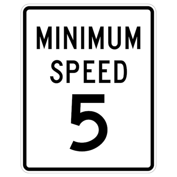 Minimum Speed 5 24X30 Diamond Grade Cubed Reflective .063 Aluminum Thickness - Sign Spec's: MUTCD:, R2-4P5, Sign Category:, Regulatory, Header/Legend:, Minimum Speed 5, Legend, Text Color:, Black, Background Color:, White, Aluminum Grade & Temper:, 5052-H38, Hole Punch Pattern:, Federal Punch: 2 Holes T&B Centered, 3 inset, Hole Diameter: 7/16 , Hole Punch Shape:, Round, Radius Corners: , 1.5