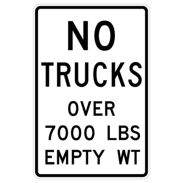 No Trucks Over 7000 LBS Empty Wt 24X36 Diamond Grade Cubed Reflective .063 Aluminum Thickness - Sign Spec's: MUTCD:, R12-3, Sign Category:, Regulatory, Header/Legend:, No Trucks Over 7000 LBS Empty Wt, Legend, Text Color:, Black, Background Color:, White, Aluminum Grade & Temper:, 5052-H38, Hole Punch Pattern:, Federal Punch: 2 Holes T&B Centered, 3 inset, Hole Diameter: 7/16 , Hole Punch Shape:, Round, Radius Corners: , 1.5