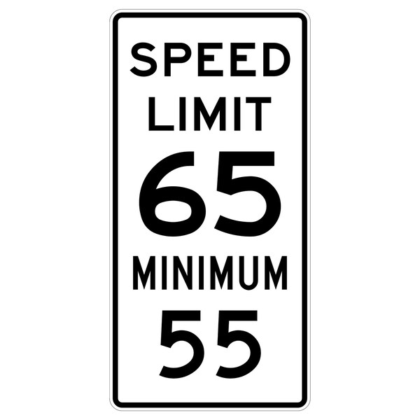Speed Limit 65 Minimum 55 24X48 Diamond Grade Cubed Reflective .063 Aluminum Thickness - Sign Spec's: MUTCD:, R2-4a655, Sign Category:, Regulatory, Header/Legend:, Speed Limit 65 Minimum 55, Legend, Text Color:, Black, Background Color:, White, Aluminum Grade & Temper:, 5052-H38, Hole Punch Pattern:, Federal Punch: 2 Holes T&B Centered, 3 inset, Hole Diameter: 7/16 , Hole Punch Shape:, Round, Radius Corners: , 1.5
