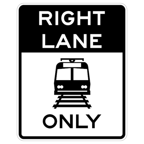 Right Lane, Train S Only 24X30 Diamond Grade Cubed Reflective .125 Aluminum Thickness - Sign Spec's: MUTCD:, R15-4a, Sign Category:, Regulatory, Header/Legend:, Right Lane, Train S Only , Legend, Text Color:, Black, Background Color:, White, Aluminum Grade & Temper:, 5052-H38, Hole Punch Pattern:, Federal Punch: 2 Holes T&B Centered, 3 inset, Hole Diameter: 7/16 , Hole Punch Shape:, Round, Radius Corners: , 1.5