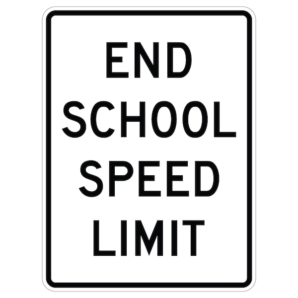 End School Zone Speed Limit 24X30 Diamond Grade Cubed Reflective .125 Aluminum Thickness - Sign Spec's: MUTCD:, S5-3, Sign Category:, School, Header/Legend:, End School Zone Speed Limit, Legend, Text Color:, Black, Background Color:, White, Aluminum Grade & Temper:, 5052-H38, Hole Punch Pattern:, Federal Punch: 2 Holes T&B Centered, 3 inset, Hole Diameter: 7/16 , Hole Punch Shape:, Round, Radius Corners: , 1.5