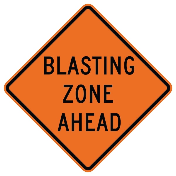Blasting Zone Ahead 30X30 Diamond Grade Cubed Fluorescent Reflective .063 Aluminum Thickness - Sign Spec's: MUTCD:, W22-1, Sign Category:, Temporary Traffic Control, Construction, Header/Legend:, Blasting Zone Ahead, Legend, Text Color:, Black, Background Color:, Fluorescent Orange, Aluminum Grade & Temper:, 5052-H38, Hole Punch Pattern:, Federal Punch: 2 Holes T&B Centered, 30 Center, Hole Diameter: 7/16 , Hole Punch Shape:, Round, Radius Corners: , 1-7/8