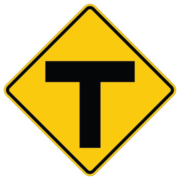 T Intersection 30X30 Diamond Grade Cubed Reflective .100 Aluminum Thickness - Sign Spec's: MUTCD:, W2-4, Sign Category:, Warning, Header/Legend:, T Intersection, Legend, Text Color:, Black, Background Color:, Yellow, Aluminum Grade & Temper:, 5052-H38, Hole Punch Pattern:, Federal Punch: 2 Holes T&B Centered, 30 Center, Hole Diameter: 7/16 , Hole Punch Shape:, Round, Radius Corners: , 1-7/8