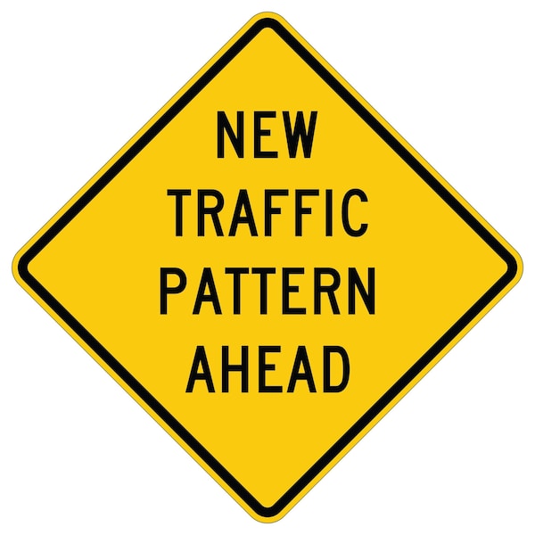 New Traffic Pattern Ahead 30X30 High Intensity Prismatic Reflective .100 Aluminum Thickness - Sign Spec's: MUTCD:, W23-2, Sign Category:, Temporary Traffic Control, Construction, Header/Legend:, New Traffic Pattern Ahead, Legend, Text Color:, Black, Background Color:, Orange, Aluminum Grade & Temper:, 5052-H38, Hole Punch Pattern:, Federal Punch: 2 Holes T&B Centered, 30 Center, Hole Diameter: 7/16 , Hole Punch Shape:, Round, Radius Corners: , 1-7/8