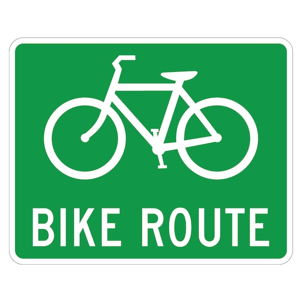 Bike Bike Route 30X24 Diamond Grade Cubed Reflective .100 Aluminum Thickness - Sign Spec's: MUTCD:, D11-1, Sign Category:, Bicycle Facility , Header/Legend:, Bike Symbol Bike Route, Legend, Text Color:, White, Background Color:, Green, Aluminum Grade & Temper:, 5052-H38, Hole Punch Pattern:, Federal Punch: 2 Holes T&B Centered, 3 inset, Hole Diameter: 7/16 , Hole Punch Shape:, Round, Radius Corners: , 1.5