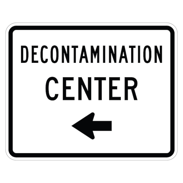 Decontamination Center Left Arrow 30X24 Diamond Grade Cubed Reflective .100 Aluminum Thickness - Sign Spec's: MUTCD:, EM 6dL, Sign Category:, Emergency, Header/Legend:, Decontamination Center Left Arrow, Legend, Text Color:, Black, Background Color:, White, Aluminum Grade & Temper:, 5052-H38, Hole Punch Pattern:, Federal Punch: 2 Holes T&B Centered, 3 inset, Hole Diameter: 7/16 , Hole Punch Shape:, Round, Radius Corners: , 1.5