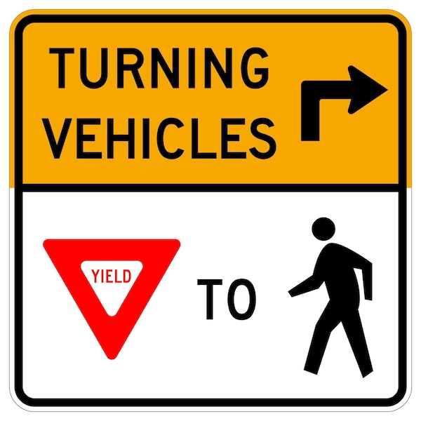 Turning Vehicle, > Yield Ped 30X30 Diamond Grade Cubed Reflective .063 Aluminum Thickness - Sign Spec's: MUTCD:, R10-15R, Sign Category:, Regulatory, Header/Legend:, Turning VehRight ArrowYield SymbolPed Symbol, Legend, Text Color:, Black, Yellow, Red, Background Color:, White, Aluminum Grade & Temper:, 5052-H38, Hole Punch Pattern:, Federal Punch: 2 Holes T&B Centered, 3 inset, Hole Diameter: 7/16 , Hole Punch Shape:, Round, Radius Corners: , 1-7/8