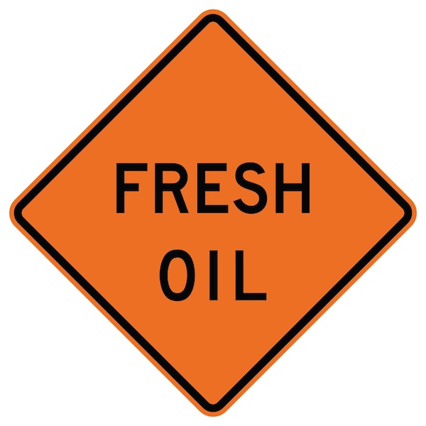 Fresh Oil 36X36 High Intensity Prismatic Reflective .063 Aluminum Thickness - Sign Spec's: MUTCD:, W21-2, Sign Category:, Temporary Traffic Control, Construction, Header/Legend:, Fresh Oil, Legend, Text Color:, Black, Background Color:, Orange, Aluminum Grade & Temper:, 5052-H38, Hole Punch Pattern:, Federal Punch: 36 Centers, Hole Diameter: 7/16 , Hole Punch Shape:, Round, Radius Corners: , 2.25