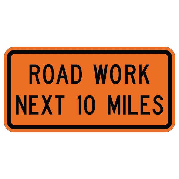 Road Work Next 10 Miles 36X18 Diamond Grade Cubed Fluorescent Reflective .063 Aluminum Thickness - Sign Spec's: MUTCD:, G20-1-10, Sign Category:, Temporary Traffic Control, Construction, Header/Legend:, Road Work Next 10 Miles, Legend, Text Color:, Black, Background Color:, Fluorescent Orange, Aluminum Grade & Temper:, 5052-H38, Hole Punch Pattern:, Federal Punch: 4 Holes, 2 Post Mount. T&B Inset 3, L&R Inset 6, Hole Diameter: 7/16 , Hole Punch Shape:, Round, Radius Corners: , 1.5