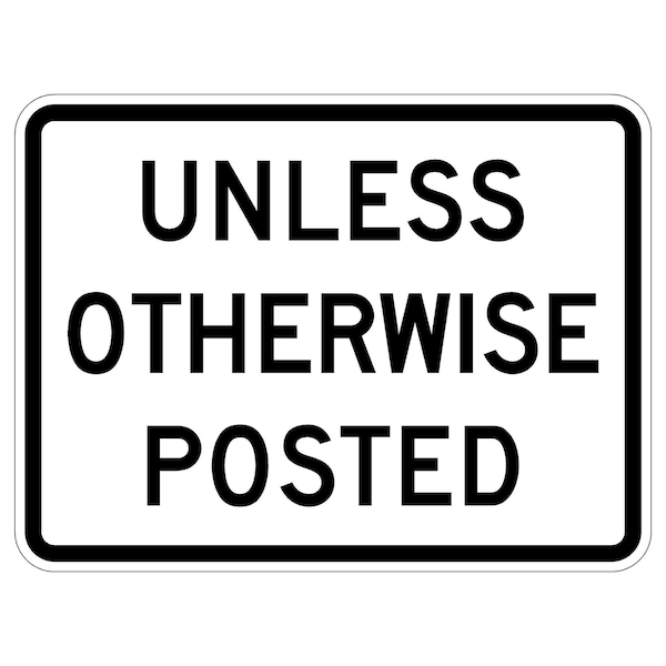 Unless Otherwise Posted 36X24 Diamond Grade Cubed Reflective .125 Aluminum Thickness - Sign Spec's: MUTCD:, R2-5P, Sign Category:, Regulatory, Header/Legend:, Unless Otherwise Posted, Legend, Text Color:, Black, Background Color:, White, Aluminum Grade & Temper:, 5052-H38, Hole Punch Pattern:, Federal Punch: 4 Holes, 2 Post Mount T&B Inset 3, L&R Inset 6, Hole Diameter: 7/16 , Hole Punch Shape:, Round, Radius Corners: , 1.5