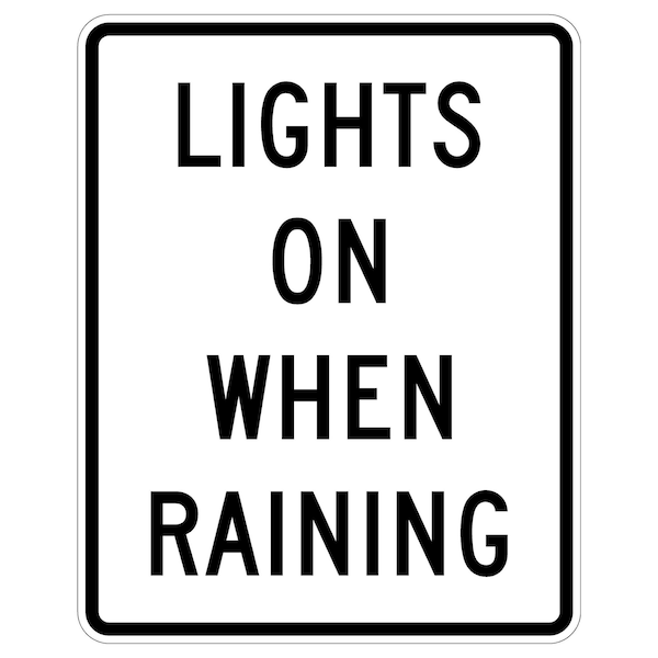 Lights On When Raining 36X48 Diamond Grade Cubed Reflective .100 Aluminum Thickness - Sign Spec's: MUTCD:, R16-6, Sign Category:, Regulatory, Header/Legend:, Lights On When Raining, Legend, Text Color:, Black, Background Color:, White, Aluminum Grade & Temper:, 5052-H38, Hole Punch Pattern:, Federal Punch: 4 Holes, 2 Post Mount T&B Inset 6, L&R Inset 6, Hole Diameter: 7/16 , Hole Punch Shape:, Round, Radius Corners: , 2.25