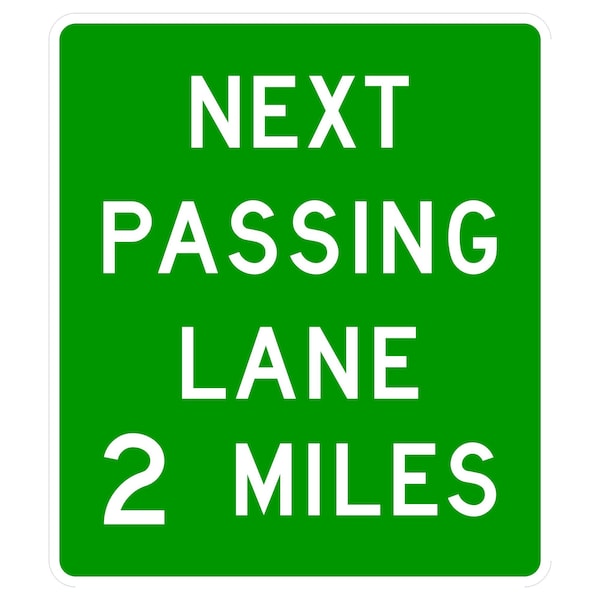 Next Passing Lane 5 Miles 42X48 Diamond Grade Cubed Reflective .100 Aluminum Thickness - Sign Spec's: MUTCD:, D17-3, Sign Category:, Guide, Header/Legend:, Next Passing Lane 5 Miles, Legend, Text Color:, Green, Background Color:, White, Aluminum Grade & Temper:, 5052-H38, Hole Punch Pattern:, Federal Punch: 4 Holes, 2 Post Mount. T&B Inset 3, L&R Inset 9, Hole Diameter: 7/16 , Hole Punch Shape:, Round, Radius Corners: , 3