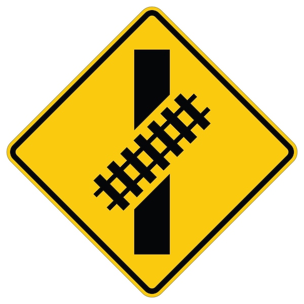 Skewed Crossing 48X48 Diamond Grade Cubed Reflective .063 Aluminum Thickness - Sign Spec's: MUTCD:, W10-12, Sign Category:, Warning, Header/Legend:, Skewed Crossing Symbol, Legend, Text Color:, Black, Background Color:, Yellow, Aluminum Grade & Temper:, 5052-H38, Hole Punch Pattern:, Federal Punch: 4 Holes, 2 Post Mount T&B Inset 15, L&R Inset 15 from Centers, Hole Diameter: 7/16 , Hole Punch Shape:, Round, Radius Corners: , 3