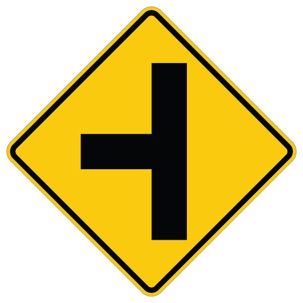 Left Side Road Intersection 48X48 Diamond Grade Cubed Reflective .100 Aluminum Thickness - Sign Spec's: MUTCD:, W2-2L, Sign Category:, Warning, Header/Legend:, Left Side Road Intersection, Legend, Text Color:, Black, Background Color:, Yellow, Aluminum Grade & Temper:, 5052-H38, Hole Punch Pattern:, Federal Punch: 4 Holes, 2 Post Mount T&B Inset 15, L&R Inset 15 from Centers, Hole Diameter: 7/16 , Hole Punch Shape:, Round, Radius Corners: , 3