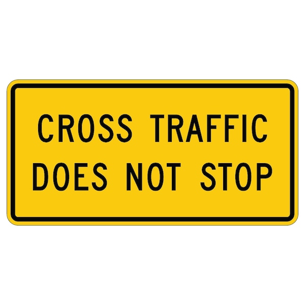 Cross Traffic Does Not Stop 48X24 Diamond Grade Cubed Reflective .063 Aluminum Thickness - Sign Spec's: MUTCD:, W4-4P, Sign Category:, Warning, Header/Legend:, Cross Traffic Does Not Stop, Legend, Text Color:, Black, Background Color:, Yellow, Aluminum Grade & Temper:, 5052-H38, Hole Punch Pattern:, Federal Punch: 4 Holes, 2 Post Mount T&B Inset 3, L&R Inset 9, Hole Diameter: 7/16 , Hole Punch Shape:, Round, Radius Corners: , 1.5